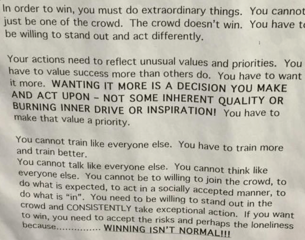 We could easily create a longer list, but as you reflect on each of the areas the question you need to ask yourself is do I look like the crowd or do I stand out in a positive way? You can’t look like everyone else and expect to achieve something better. Because remember WINNING ISN’T NORMAL!
